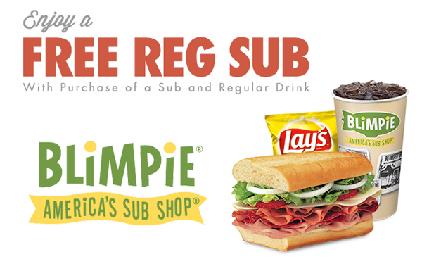 Get a FREE Blimpie Reg Sub with the purchase of any Sub and regular drink of your choice. An extra flavor packed Sub of your choice is the perfect way to add flavor to your day. Freshly baked bread that is layered with the meat, cheese, vegetables, and sauces of your choice. Enjoy the ultimate FREE reg sub of your choice at Blimpie!