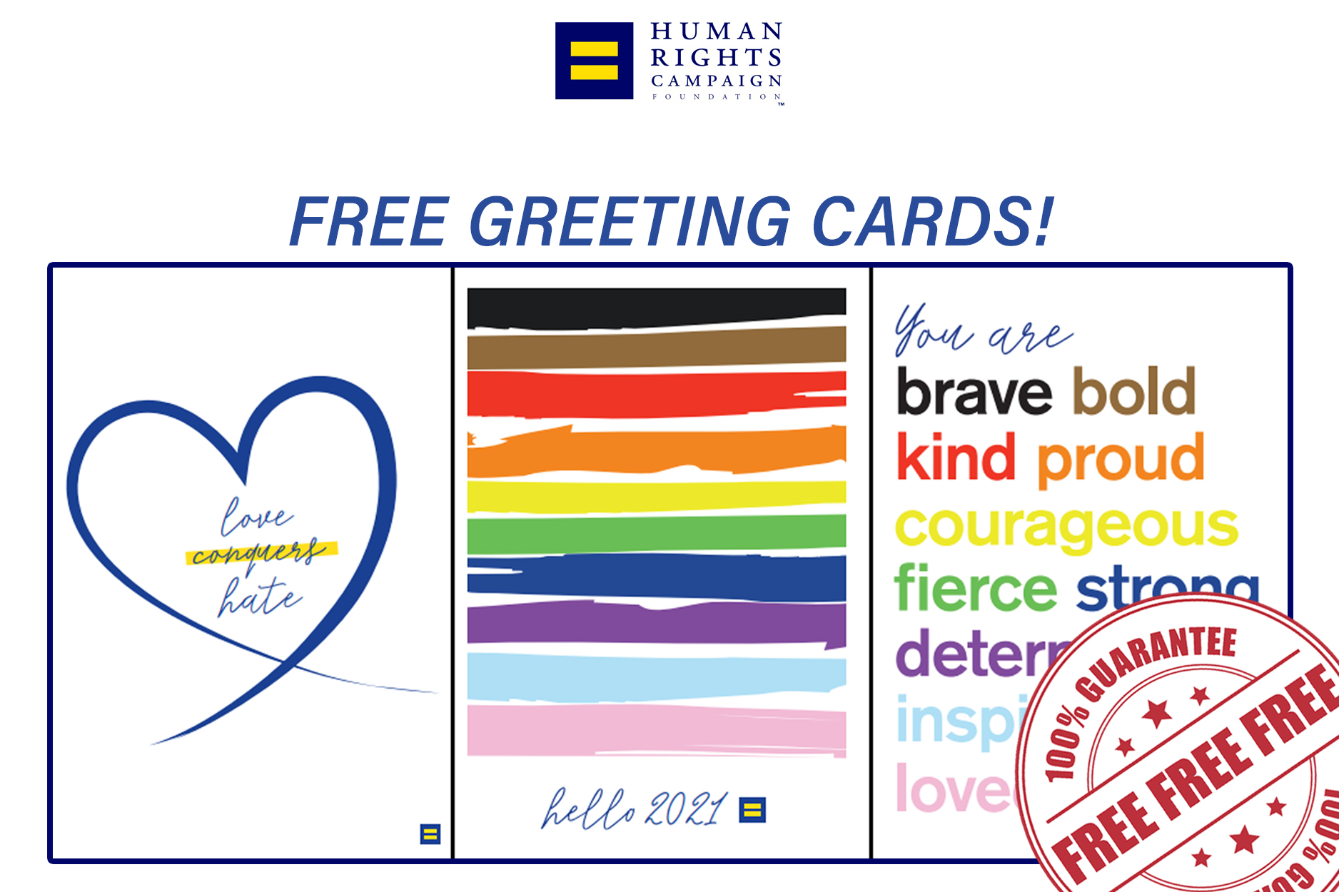HRC is giving away free greeting cards to be sent to your loved ones. The greeting cards are blank inside. Our mission is to inspire and engage individuals and communities, the Human Rights Campaign strives to end discrimination against LGBTQ people and realize a world that achieves fundamental fairness and equality for all. HRC envisions a world where lesbian, gay, bisexual, transgender and queer people are ensured equality and embraced as full members of society at home, at work and in every community.